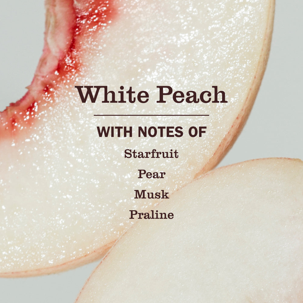? SCENTS DESIGNED WITH PEOPLE AND PETS IN MIND: White Peach scent smells like a ripe and juicy peach. a refreshing burst of sweetness that leaves your pup smelling as delightful as they are. With notes of starfruit. pear. musk. and praline.